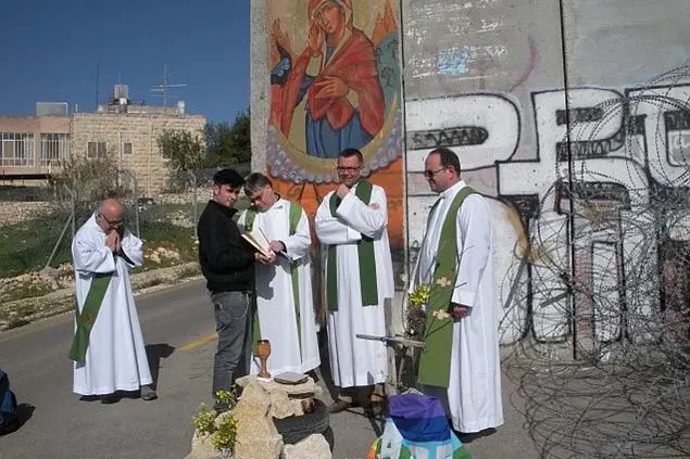 C'è stata la messa sotto gli ulivi a Beit Jala e da lì una processione silenziosa ha raggiunto la parte di muro che costeggia il Caritas Baby Hospital (l'ospedale pediatrico, gestito dalle suore elisabettine di Padova), per la recita del rosario. Si è riposta la speranza nella Madonna, come ha fatto papa Francesco, il primo gennaio 2014, Giornata mondiale per la pace: «A te, Maria, affidiamo il grido di pace delle popolazioni oppresse dalla guerra e dalla violenza, perché prevalgano il coraggio del dialogo e della riconciliazione». Si è meditato sulle parole di Etty Hillesum, a cento anni dalla sua nascita: “Il filo spinato è una pura questione di opinioni. 'Noi dietro il filo spinato? - diceva un vecchio indistruttibile accennando malinconicamente con la mano - Sono piuttosto loro a vivere dietro il filo spinato', e intanto indicava le alte ville, che stanno come guardiani dall'altra parte della recinzione” (Hillesum, Lettere 1942-43).