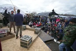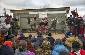 A Calais, del resto, nei mesi scorsi erano già passate altre compagnie francesi ed europee, impegnate in attività ricreative, spettacoli di teatro ed eventi nel periodo delle feste. Ogni volta, come per l’arrivo degli attori britannici, il palcoscenico è stato realizzato in tutta fretta di prima mattina. Usando le assi di legno che, dopo essere state calpestate dagli attori e riempite di suoni e parole, la sera sono servite di nuovo per costruire rifugi per il corpo, anziché per lo spirito.