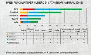 La Cina (che ha patito ben 42 catastrofi naturali, nel solo anno passato), gli Stati Uniti, le Filippine, l'Indonesia e l'India sono i cinque Paesi più colpiti. Secondo i dati del dossier di Agire, peraltro, il 2013 può essere considerato un anno relativamente moderato: con un calo di emergenze pari al 9,2% rispetto al 2012, si attesta con un 14,9% al di sotto della media della decade 2003-2012 (388 disastri naturali l’anno).