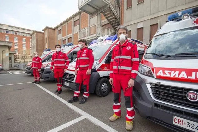 (Foto Ansa: operatori della Croce rossa con macchine e ambulanze a Piacenza)