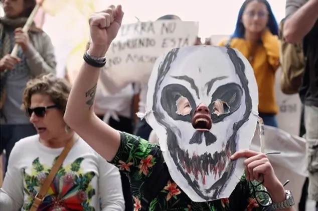 (in alto: un dimostrante con una maschera da teschio durante una manifestazione in difesa dell'ambiente dello scorso 23 agosto a Quito, la capitale dell'Ecuador)