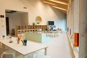 quello destinato all’accoglienza che funge non solo da spazio comunicativo tra famiglie, insegnanti e educatrici, bambine e bambini, ma anche da laboratorio musicale, grazie al pianoforte situato al centro della stanza ed un’ampia libreria in cui è ordinato lo strumentario. Per incentivare le bambine e i bambini alla scoperta e curiosità attraverso l’uso dei sensi, è stato pensato un ampio spazio polifunzionale, caratterizzato dall’atelier degli odori e del gusto e dalla biblioteca. Nella stessa sala i piccoli potranno condividere il momento del pasto, essendo la struttura dotata di cucina totalmente attrezzata. Tutti questi ambienti affacciano nell’Agorà, spazio dedicato al racconto dove poter mostrare i progetti scolastici ed educativi avviati e conclusi all’interno del Polo dell’Infanzia. Una scuola a misura di bambino ma anche rispettosa dell’ambiente. A partire dall’aspetto educativo, con la realizzazione del laboratorio di arte, scienze e sostenibilità in cui bambine e bambini potranno creare e sperimentare anche attraverso la manipolazione di materiali di recupero, di scarto industriale e naturali. Inoltre la struttura è stata prevalentemente realizzata con materiali interamente riciclabili e dotata di impianti che hanno un impatto energetico prossimo allo zero. Un investimento totale che si aggira intorno ai 2 milioni di euro, per il quale sono state impiegate 30 aziende, di cui oltre il 90% maestranze locali. La progettazione degli spazi è stata oggetto di un concorso di idee a chiamata indetto dalla Fondazione Bocelli nel secondo semestre del 2022 e aperto agli studi di architettura con talenti under 35. Il vincitore, lo studio BDRBureau di Torino, ha lavorato in sinergia con il team multidisciplinare ABF per la realizzazione della nuova struttura.