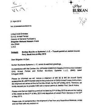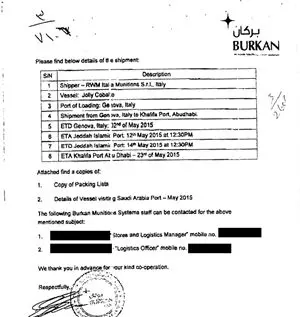 Alcuni fra i più terribili ordigni utilizzati sono fabbricati in Italia e assemblati negli Emirati Arabi Uniti. Secondo documenti diffusi in internet in questi giorni, e frutto di un attacco hacker al ministero degli Esteri dell'Arabia Saudita (con la sottrazione di almeno 500.000 documenti), il 2 maggio scorso è partita dal porto di Genova la nave Jolly Cobalto: a bordo 6 container di bombe per aereo MK82 e MK 84 senza esplosivo (classificati quindi come semplici involucri accessori). La destinazione è Jeddah in Arabia Saudita. Da qui sarebbero state trasportate via terra ad Abu Dhabi, dove la società Burkan Defence provvede all'assemblaggio dei vari componenti (ottemperando al contratto DP3/4/8/1/2008/34/A) stipulato con il ministero della Difesa saudita fin dal 2008.
