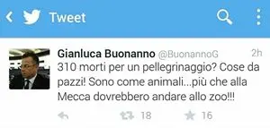 Muoiono 717 persone a La Mecca e Gianluca Buonanno non perde l’occasione di un tweet da manuale del linguaggio d’odio online. Cinguetta: «Cose da pazzi! Sono come animali…più che alla Mecca dovrebbero andare allo zoo!!!».