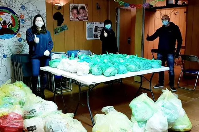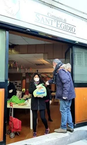 Come già accade in altre sedi italiane della Comunità di Sant'Egidio, anche in Via Caio Manilio si svolgono abitualmente attività didattiche come il doposcuola, la scuola della pace e l'insegnamento della lingua italiana agli stranieri, ed ora l'aggregazione prosegue sui social: “La tecnologia ci sta aiutando molto. Grazie a whatsapp è possibile collegarci con i bambini e proseguire gli insegnamenti”. - dichiara Giorgio Bevilacqua, responsabile d'area - “Contemporaneamente c'è da coordinare i volontari e gestire il fabbisogno di beni di prima necessità. C'è una grande richiesta di mascherine. Nelle farmacie non si trovano ma alcune amiche e amici le stanno realizzando a mano”.- conclude Giorgio - “C'è tanta voglia di aiutare. A volte non sappiamo come fare, ma è sufficiente bisogna passar la voce e la solidarietà non tarda ad arrivare”. E' tutto pronto per il giro che questa sera coprirà un perimetro più ampio del previsto. Tina e Mario salgono in macchina mantenendo una distanza di sicurezza. La prima tappa la fanno sotto i portici di Piazza dei Consoli, davanti ad una sala giochi chiusa come tutto il resto delle attività commerciali. C'è un gruppetto di amici che li sta aspettando da un po'. Uno di loro si avvicina, prende le buste e ringrazia. E per una manciata di secondi i loro occhi si illuminano e il cibo insieme alle parole scambiate di fretta, sono come una carezza sull'anima che mitiga la durezza delle loro vite.