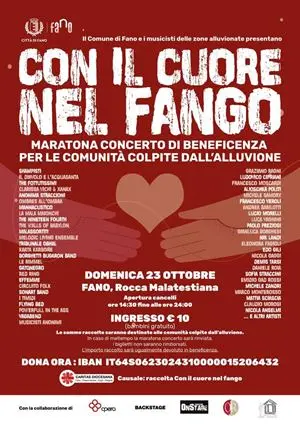 Il biglietto dell'evento costa 10 euro (gratuiti per i bambini). Il ricavato sarà interamente devoluto, attraverso la Caritas diocesana di Fano, Fossombrone, Cagli e Pergola, a sostegno delle comunità alluvionate. Pe fare una donazione spontanea si può già utilizzare il codice IBAN IT64S0623024310000015206432 e nell’intestazione va scritto: "Raccolta Con il cuore nel fango".