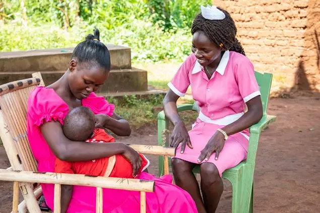 (Nella foto di Amref: Hellen Hadia accanto a una mamma con il suo bambino)