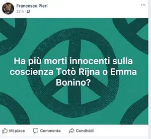 “Ha più morti innocenti sulla coscienza Totò Riina o Emma Bonino?” ha chiesto provocatoriamente il prelato, riferendosi evidentemente all’impegno della Bonino per la legge sull’aborto. Ne è nato un caso che si aggiunge a quello recentissimo di un altro sacerdote bolognese, don Lorenzo Guidotti. Questa volta però non si tratta di un parroco qualunque ma di un docente della Facoltà teologica dell’Emilia Romagna. Parole che feriscono non solo la Bonino, perché l’aborto è comunque un dramma, cui non ha fatto seguito nessuna parola di rettifica o di chiarimento. Anche la Curia di Bologna non ha voluto esprimere distinguo o giudizi ma si è limitata a “un no comment” mentre un altro sacerdote bolognese, don Massimo Vacchetti, vice economo dell’Arcidiocesi e responsabile della pastorale sportiva, non ha esitato a esprimere il suo “mi piace”.