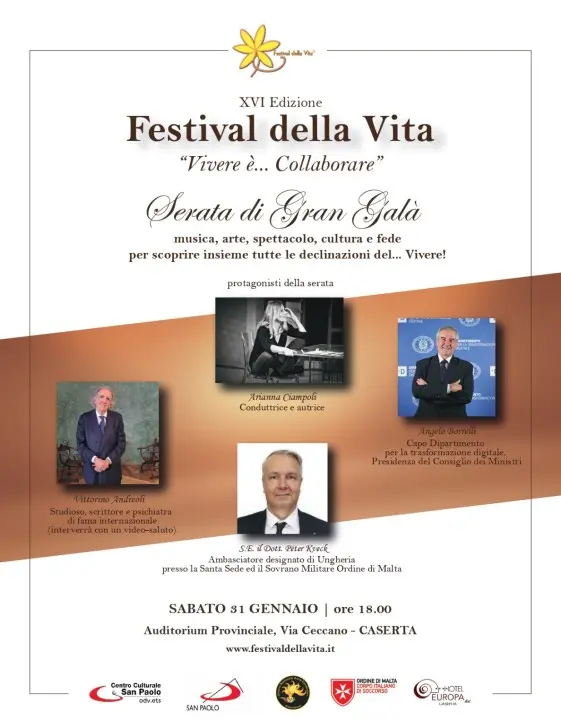 Il culmine della manifestazione si terrà sabato 31 gennaio alle ore 18 presso l’Auditorium Provinciale di Caserta. Il Gran Galà ospiterà personalità di rilievo internazionale e nazionale, tra cui Péter Kveck, Ambasciatore designato d’Ungheria presso la Santa Sede; Angelo Borrelli, Capo Dipartimento per la Transizione Digitale della Presidenza del Consiglio. Verrà premiato anche Vittorino Andreoli, che interverrà con un video saluto.