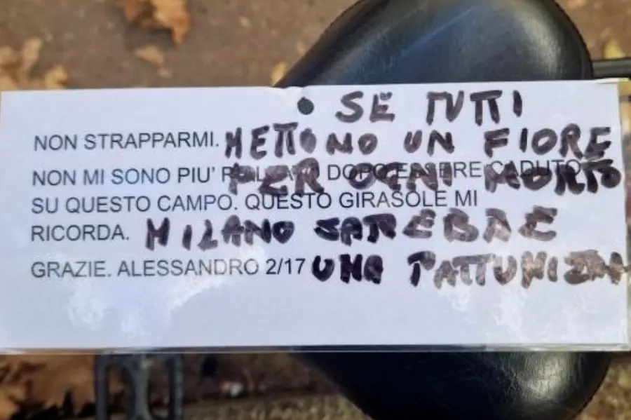 Ma la mamma di Alessandro, così si chiamava questo ragazzo, non si perde d’animo e con un cartello, gentile e civile, si trova a spiegare cosa significa quel fiore e, peggio ancora, è costretta a chiedere di non toglierlo. Lo fa a nome di suo figlio: “Non strapparmi. Non mi sono più rialzato dopo essere caduto su questo campo. Questo girasole mi ricorda” Alessandro.