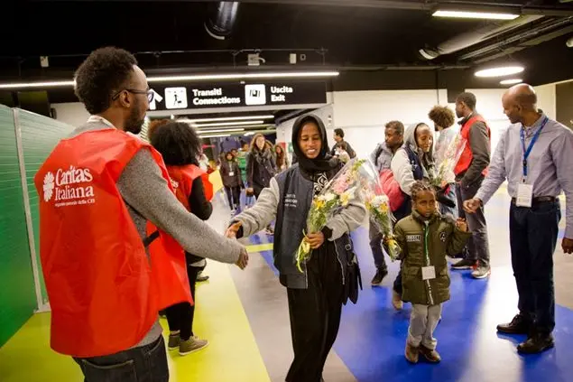 Nella foto (di Max Hirzel) uno dei gruppi di profughi provenienti dall'Etiopia al momento del loro arrivo a Fiumicino, nel febbraio 2018.