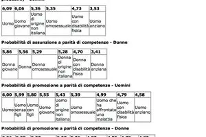 I ricercatori del Lab sono andati poi a verificare le opinioni circa l'equità dei percorsi di assunzione e di avanzamento di carriera. E qui risulta evidente la discriminazione percepita nei confronti di alcune caratteristiche sociali. Tra gli uomini, le probabilità di essere assunti è ritenuta maggiore se si è giovani (un valore medio di 6,06 in una scala da 1 a 7), mentre scende se si è stranieri (5,36), omosessuali (5,35), disabili (4,73) o anziani (3,53). Lo stesso vale per le donne che, peraltro, raggiungono valori in genere più bassi degli uomini, a parità di caratteristiche. Se la probabilità per le donne è 5,56, donne omosessuali o straniere oscillano intorno al 5,28, mentre per le donne anziane la probabilità crolla a 3,41.