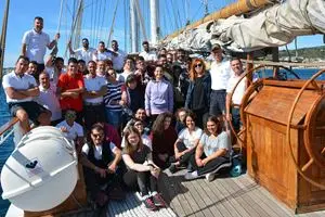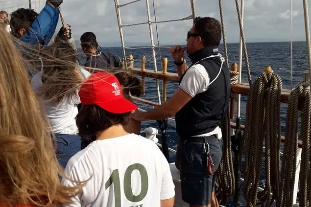 Nella foto: Con i ragazzi e gli operatori, l’equipaggio di Nave Italia. Da sinistra: il comandante in seconda Michele Erra, Andrea Baccari, Alessandro Capasso e Orazio Casolo. In piedi dietro, Giuseppe Chianello, Nicola Guarino, Vincenzo Mandaglio, il nostromo Giuseppe Carnovale, Gianluca Ingenito, il cuoco Alessandro Raffo, il capo macchina Antonio Mignano. Al centro, Luca Laiso, segretario di rotta e ballerino, l’infermiere, ma per tutti doc, Michele Teofilo. A destra, con il berretto della nave, il comandante Dario Gentile, accanto a lui Leonardo Correnti. In basso a sinistra il direttore di macchina Gianluca Conti. Mancano all’appello, perché impegnati in altri servizi, i nocchieri Andrea Poso e Andrea Segafreddo, perché in licenza, ma hanno partecipato alle altre settimane, Rosario Longo e Marco Dinoi. Si nasconde alla vista, ma c’è nella penultima fila, l’altro cuoco Antonino Mandanici. Seminascosta con la maglia a righe verticali gialle e bianche, Valentina Laface. Seduta in basso a destra con la maglietta di Nave Italia, la project manager della Fondazione Tender, Angela Maria Campo. La foto è stata scattata da Alfredo Romino, ufficiale di rotta e P.I della nave.