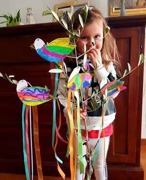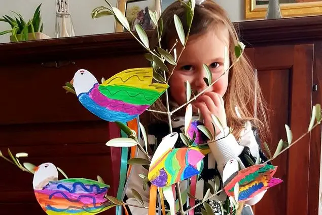 Eccola appena terminato di disegnare e addobbare i rami d’ulivo,