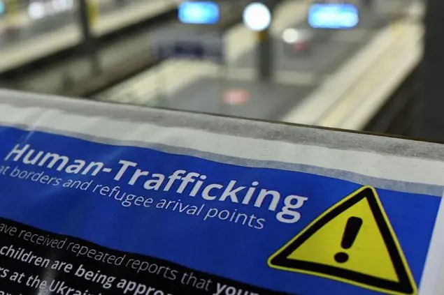 (Foto Reuters: una cartello che segnala il pericolo di traffico di esseri umani per migranti e rifugiati alla stazione centrale di Berlino)