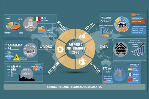 Presentato a Roma, lo scorso 8 ottobre, il XXIX Rapporto Immigrazione Caritas Migrantes. Come di consueto si è proceduto ad un’attenta analisi dei dati sul fenomeno dell’immigrazione nel nostro Paese sotto molteplici aspetti che vanno dalla scuola, al lavoro, all’economia fino all’integrazione. Ciò che emerge più di ogni altra cosa è il fatto che ormai da qualche anno il trend di crescita dei cittadini stranieri in Italia è decisamente diminuito, a dispetto di quanto la narrativa comune sul fenomeno migratorio cerca di far passare. Dal 2018 al 2019 si sono registrati, infatti, appena 47 mila residenti e 2.500 titolari di permesso di soggiorno in più. I fattori di questo vistoso rallentamento sono molteplici ed ascrivibili sia a dinamiche demografiche generali che a politiche migratorie restrittive. Da un lato, infatti, il mutato comportamento riproduttivo della popolazione straniera ha segnato negli ultimi anni una vistosa diminuzione delle nascite (da 67.933 nel 2017 a 62.944 nel 2019), dall’altro l’impossibilità di fare ingresso nel nostro paese in maniera regolare (attraverso decreti flussi annuali) ha inciso negativamente sull’andamento delle presenze.