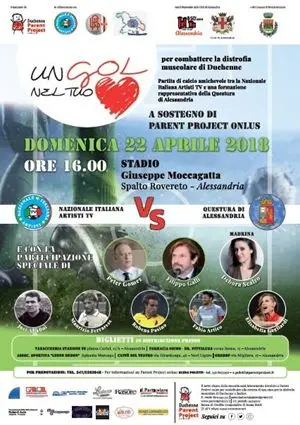 È un evento con la Nazionale Italiana Artisti TV per Parent Project onlus l’associazione di pazienti e genitori di bambini e ragazzi con distrofia muscolare di Duchenne e Becker,che si tiene domenica 22 aprile presso lo stadio “Giuseppe Moccagatta” – Spalto Rovereto - Alessandria.L’evento nasce grazie alla collaborazione con la Nazionale Italiana Artisti TV, l’Unione Sportiva Alessandria Calcio 1912 e la Questura di Alessandria.