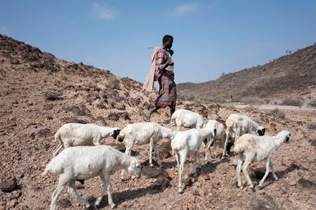 Mako stringe fra le sue braccia Amaal, di appena tre mesi, sullo sfondo della terra arsa, stremata dalla siccità, della regione dei Somali, in Etiopia sudorientale. Lei ha 25 anni, è sposata con Mahamud, che ne ha 36. Per tutta la loro vita entrambi non hanno conosciuto altro che l’allevamento di pecore, capre e mucche. Come molti altri abitanti di questa terra, Mako non è andata a scuola. «I miei genitori erano pastori », racconta, «noi siamo sempre stati pastori. Durante la siccità camminiamo per almeno due ore per andare a recuperare l’acqua. Ma cos’altro possiamo fare?». Tutto il suo mondo è la pastorizia. «Nella mia immaginazione io non riesco a vedere un’altra vita. Ma se perdiamo i nostri animali, quale sarà il nostro futuro?».