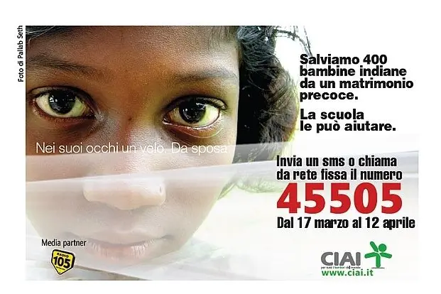 “Nei suoi occhi un velo. Da sposa”. È uno degli slogan della campagna del Ciai (Centro aiuti per l'infanzia) contro i matrimoni precoci in India. Ma quel velo, in realtà, è più un “velo di tristezza”, perché, nonostante la legge indiana nel 2006 abbia dichiarato illegale il matrimonio infantile (Children Marriage Prohibition Act), fissando l'età minima a 18 e 21 anni, rispettivamente per ragazze e ragazzi, tale pratica resta ampiamente praticata in vari Stati, specialmente nelle aree rurali.