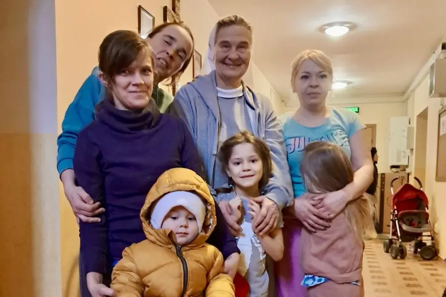 Suor Kamila, seduta a destra, suor Sabina, a sinistra, e suor Lidia, in piedi, con alcune mamme e i loro figli nella casa di Korotych.
