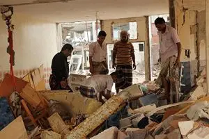 Gli uomini scavano tra le macerie in una zona residenziale abitativa dei dipendenti dell'impianto Mokha Steam Power (una centrale elettrica) e delle loro famiglie. Il modulo abitativo è stato colpito da sei bombe ad alto potenziale sganciate dagli aerei della coalizione filo-saudita: 67 persone sono state uccise (tra cui 10 bambini) il 24 luglio scorso.